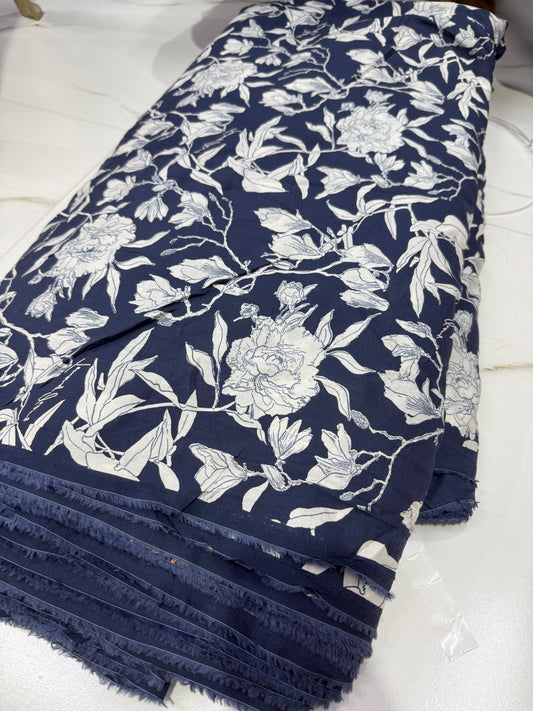 Buy Cotton Viscose Dark Blue Base White Floral Printed Fabric