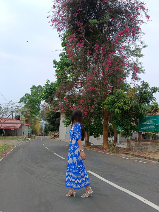 Buy 50s Poplin Electric Blue Floral Printed Fabric