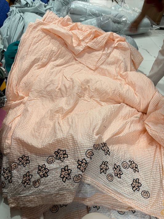 Summer Peach Cotton Seersucker Gingham Leafy Embroidery