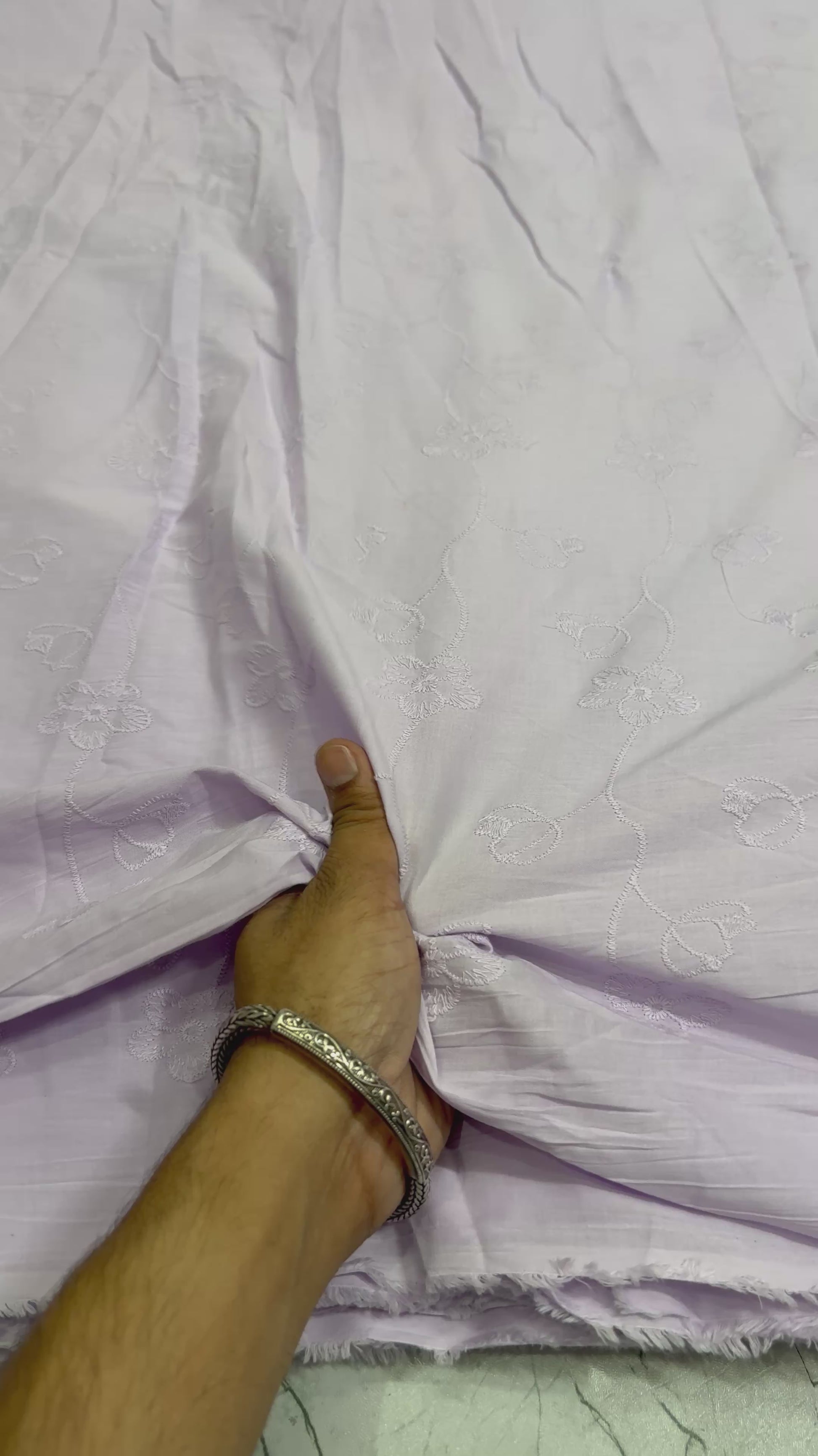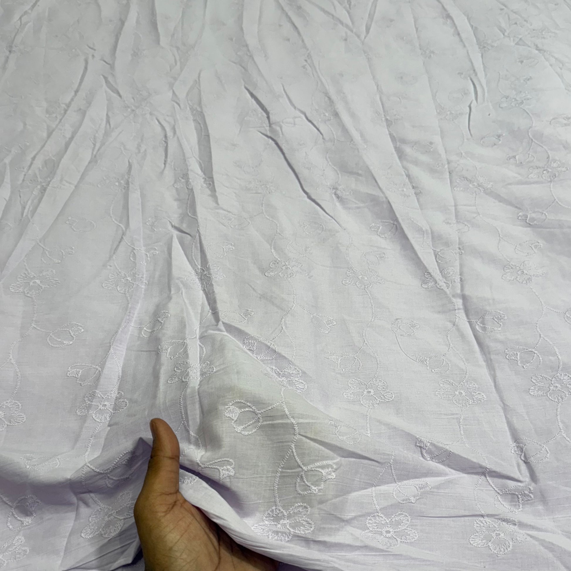 Cotton chikan embroidered fabric exudes elegance and tradition. Made from breathable cotton, it showcases intricate chikan embroidery, celebrated for its delicate patterns and exquisite craftsmanship. Perfect for a variety of apparel, from casual to formal wear, this fabric brings a touch of sophistication and cultural charm to any garment or project.