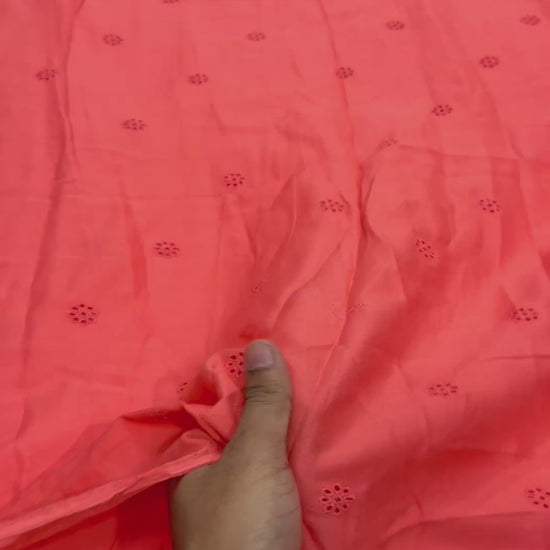 Cotton chikan embroidered fabric exudes elegance and tradition. Made from breathable poplin, it showcases intricate chikan embroidery, celebrated for its delicate patterns and exquisite craftsmanship. Perfect for a variety of apparel, from casual to formal wear, this fabric brings a touch of sophistication and cultural charm to any garment or project.