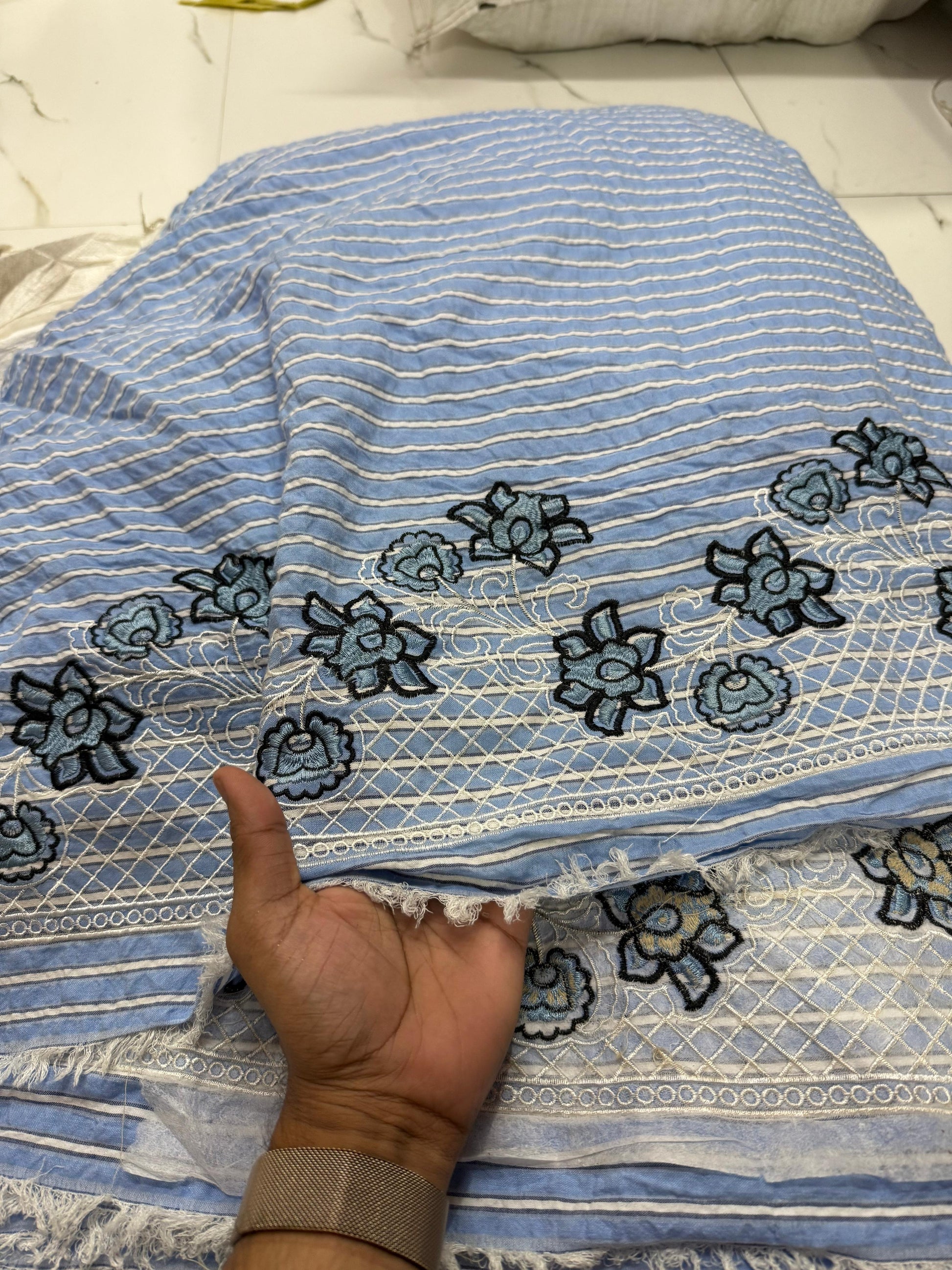 Premium Seersucker Formal Blue Stripe Border Embroidery Fabric