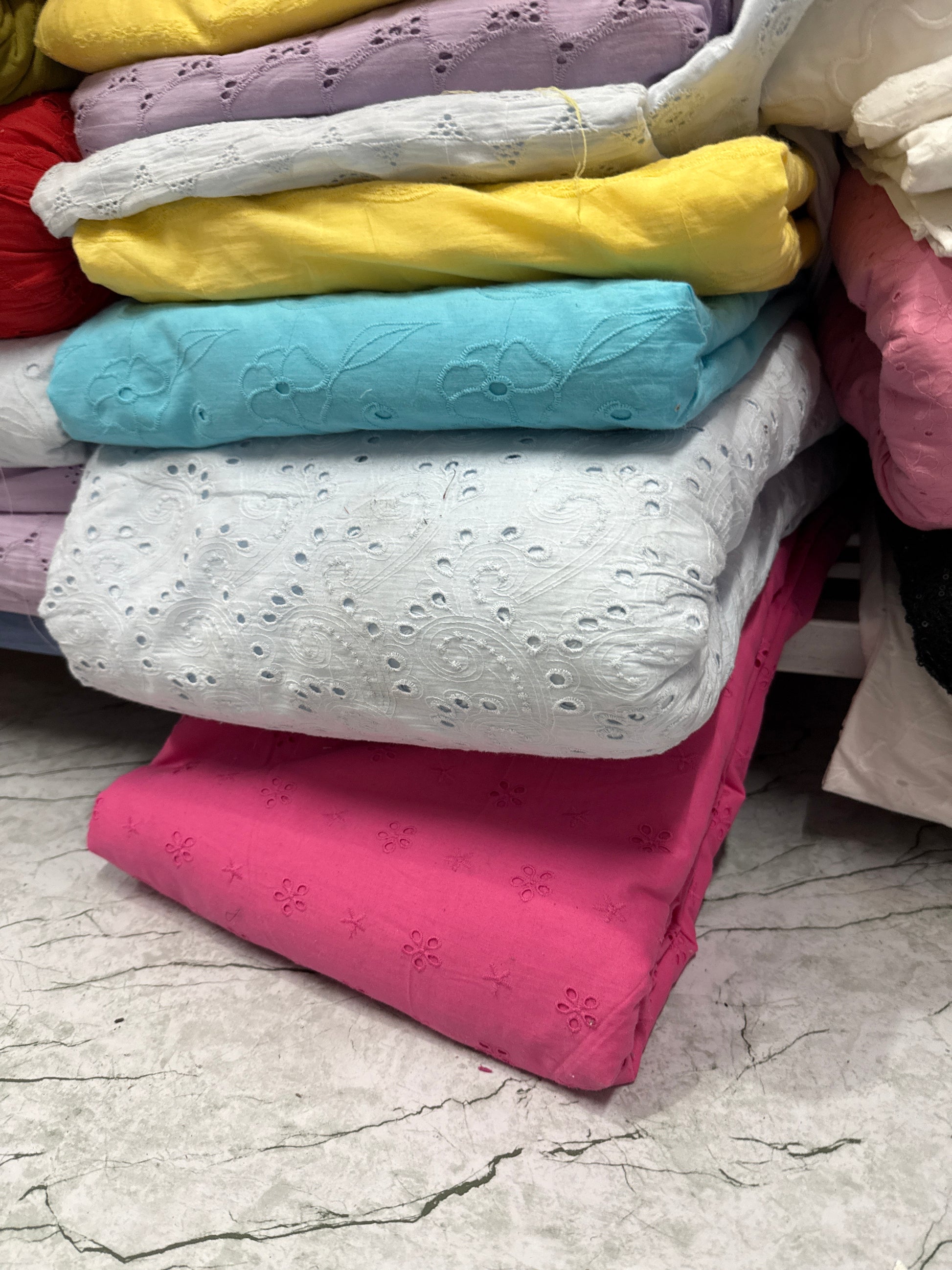 Cotton chikan embroidered fabric exudes elegance and tradition. Made from breathable cotton, it showcases intricate chikan embroidery, celebrated for its delicate patterns and exquisite craftsmanship. Perfect for a variety of apparel, from casual to formal wear, this fabric brings a touch of sophistication and cultural charm to any garment or project.Â