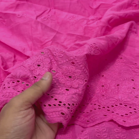 Cotton chikan embroidered fabric exudes elegance and tradition. Made from breathable cotton, it showcases intricate chikan embroidery, celebrated for its delicate patterns and exquisite craftsmanship. Perfect for a variety of apparel, from casual to formal wear, this fabric brings a touch of sophistication and cultural charm to any garment or project.