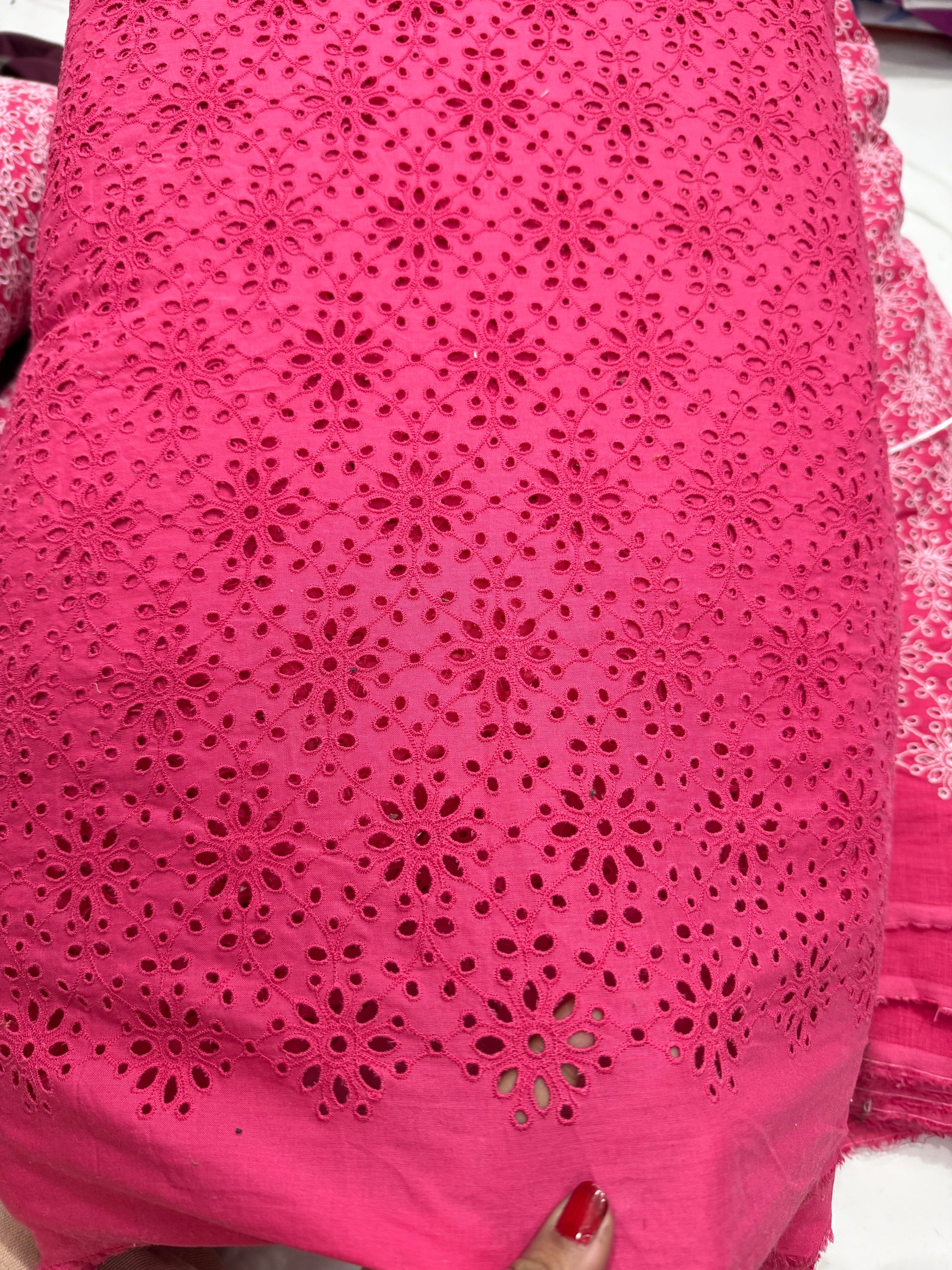 Cotton chikan embroidered fabric exudes elegance and tradition. Made from breathable cotton, it showcases intricate chikan embroidery, celebrated for its delicate patterns and exquisite craftsmanship. Perfect for a variety of apparel, from casual to formal wear, this fabric brings a touch of sophistication and cultural charm to any garment or project.