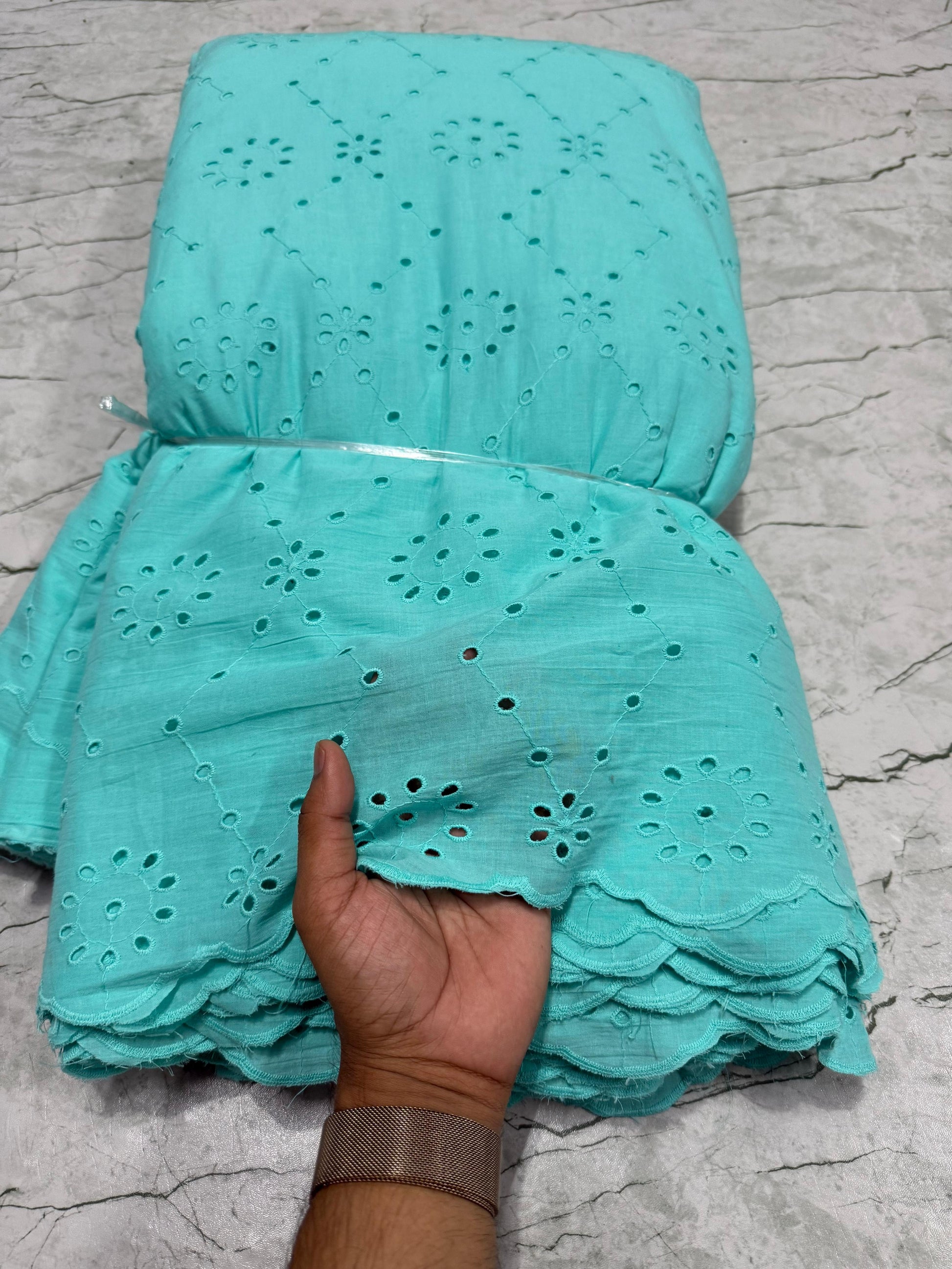 Cotton chikan embroidered fabric exudes elegance and tradition. Made from breathable cotton, it showcases intricate chikan embroidery, celebrated for its delicate patterns and exquisite craftsmanship. Perfect for a variety of apparel, from casual to formal wear, this fabric brings a touch of sophistication and cultural charm to any garment or project.