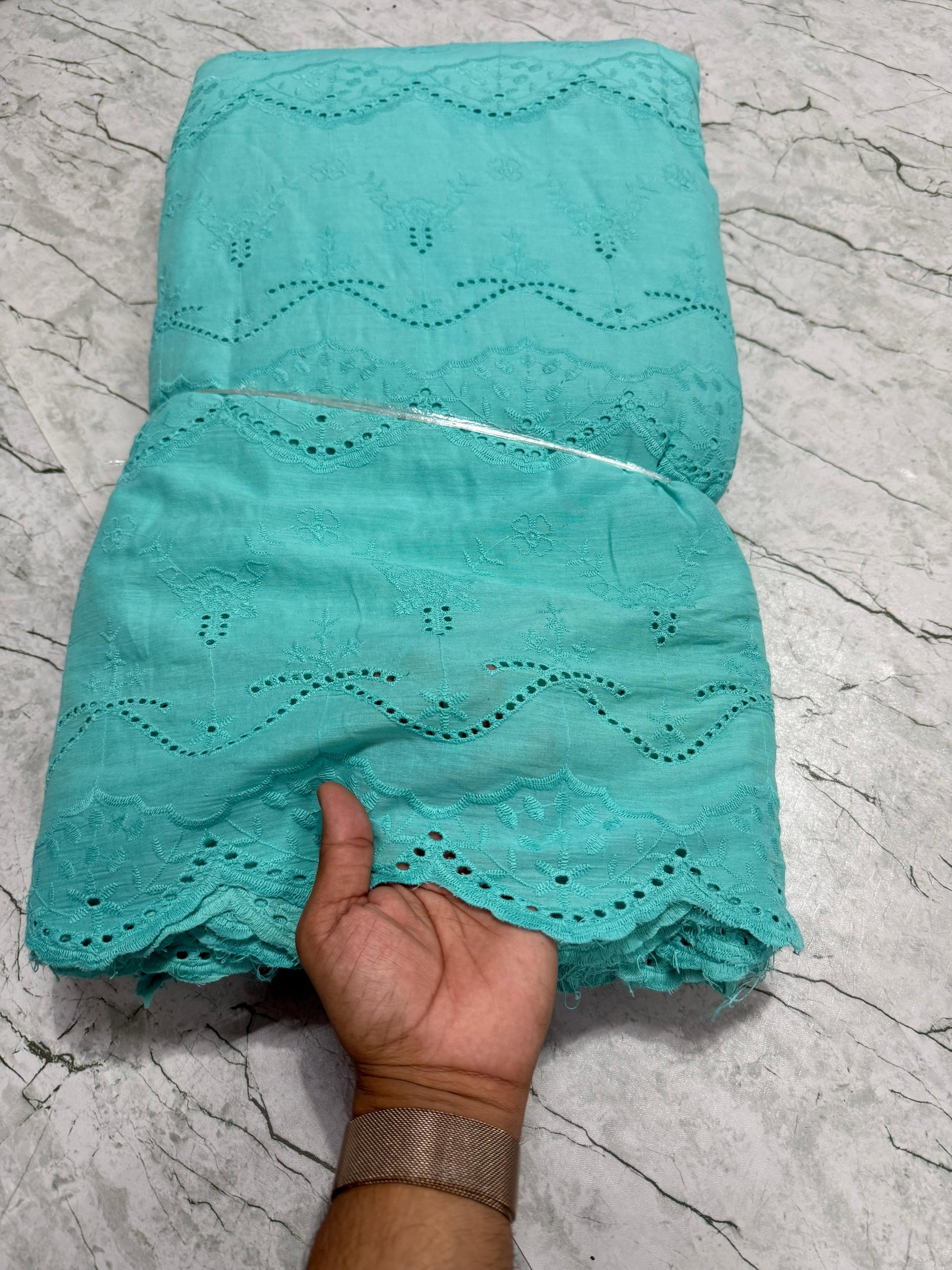 Cotton chikan embroidered fabric exudes elegance and tradition. Made from breathable cotton, it showcases intricate chikan embroidery, celebrated for its delicate patterns and exquisite craftsmanship. Perfect for a variety of apparel, from casual to formal wear, this fabric brings a touch of sophistication and cultural charm to any garment or project.