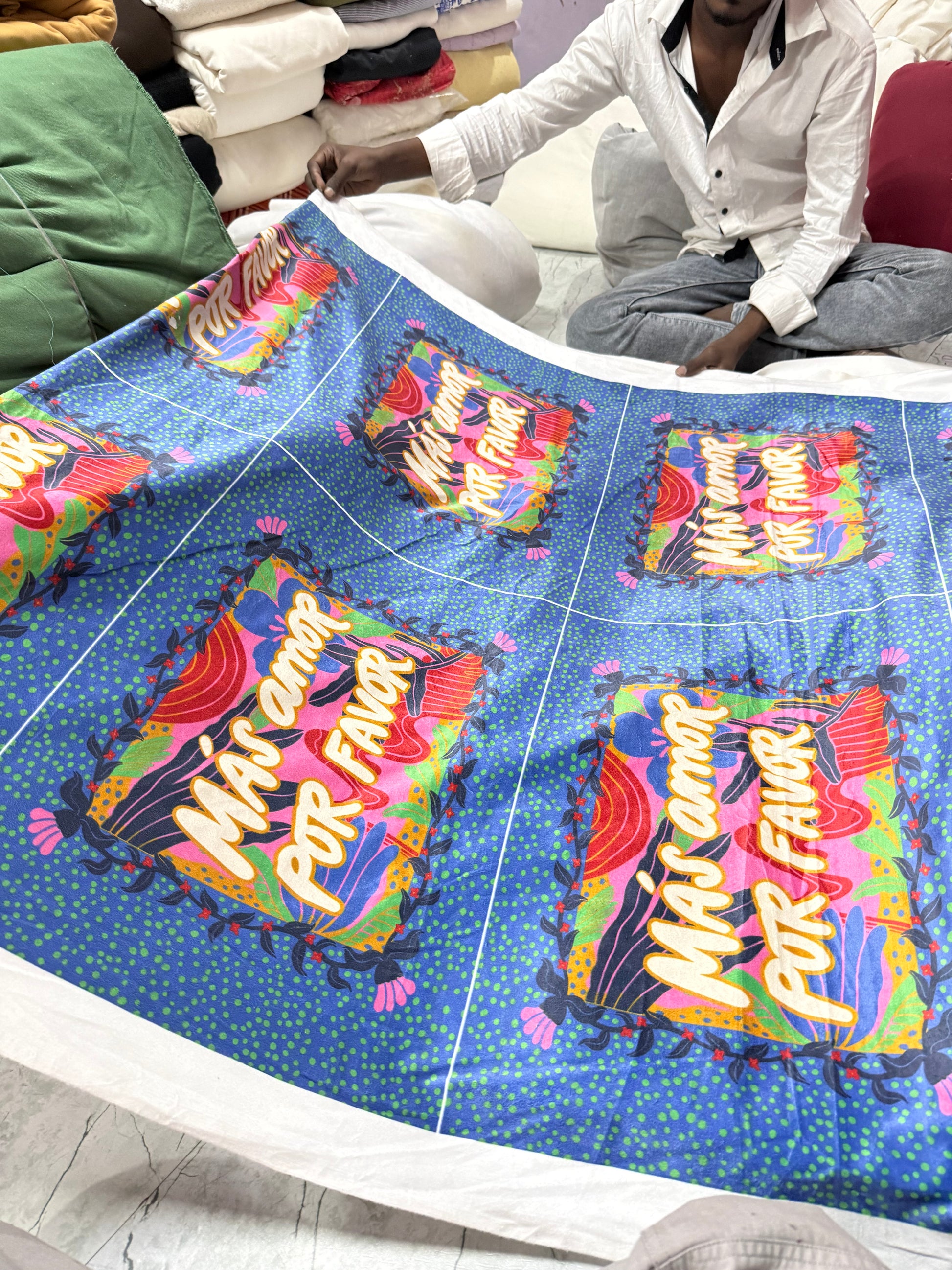 Buy Cotton Velvet Blue Base Typography Printed Fabric
