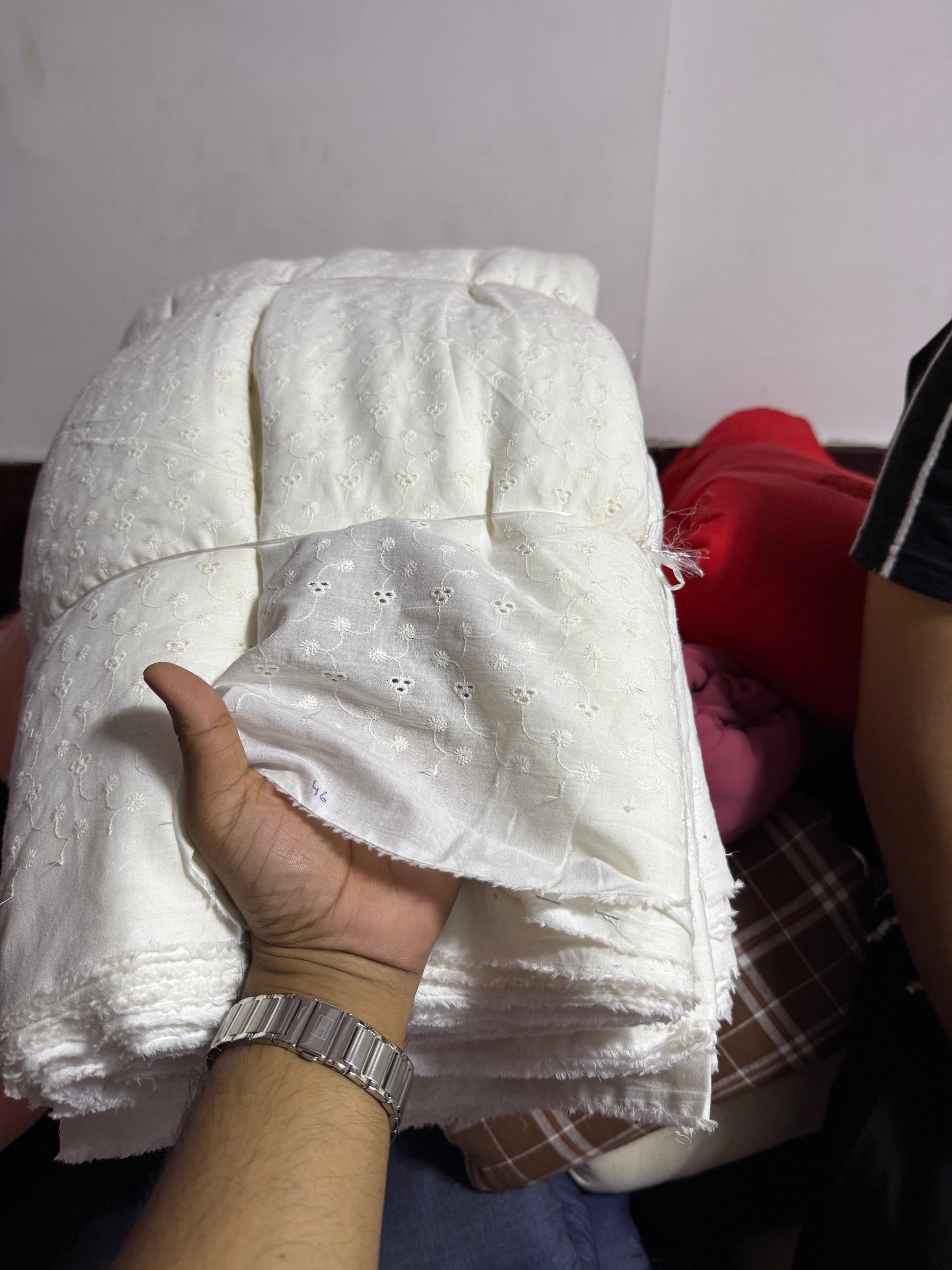 Cotton chikan embroidered fabric exudes elegance and tradition. Made from breathable cotton, it showcases intricate chikan embroidery, celebrated for its delicate patterns and exquisite craftsmanship. Perfect for a variety of apparel, from casual to formal wear, this fabric brings a touch of sophistication and cultural charm to any garment or project.