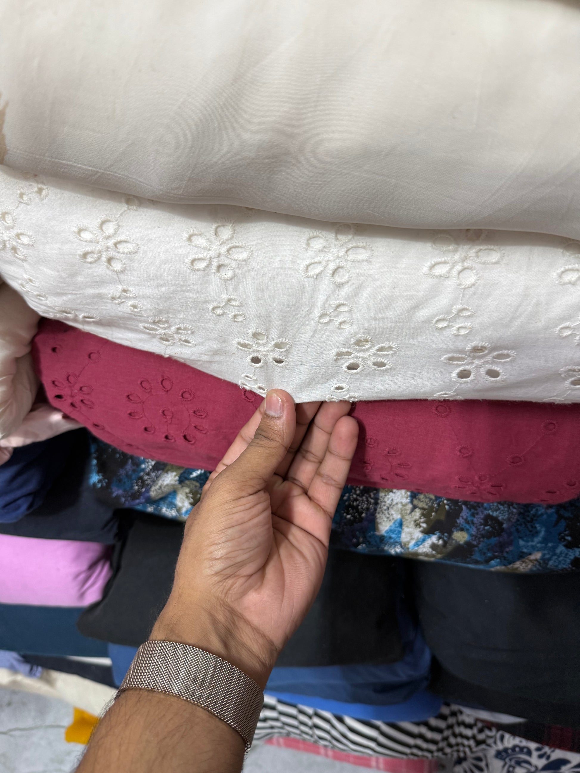 Cotton chikan embroidered fabric exudes elegance and tradition. Made from breathable cotton, it showcases intricate chikan embroidery, celebrated for its delicate patterns and exquisite craftsmanship. Perfect for a variety of apparel, from casual to formal wear, this fabric brings a touch of sophistication and cultural charm to any garment or project.