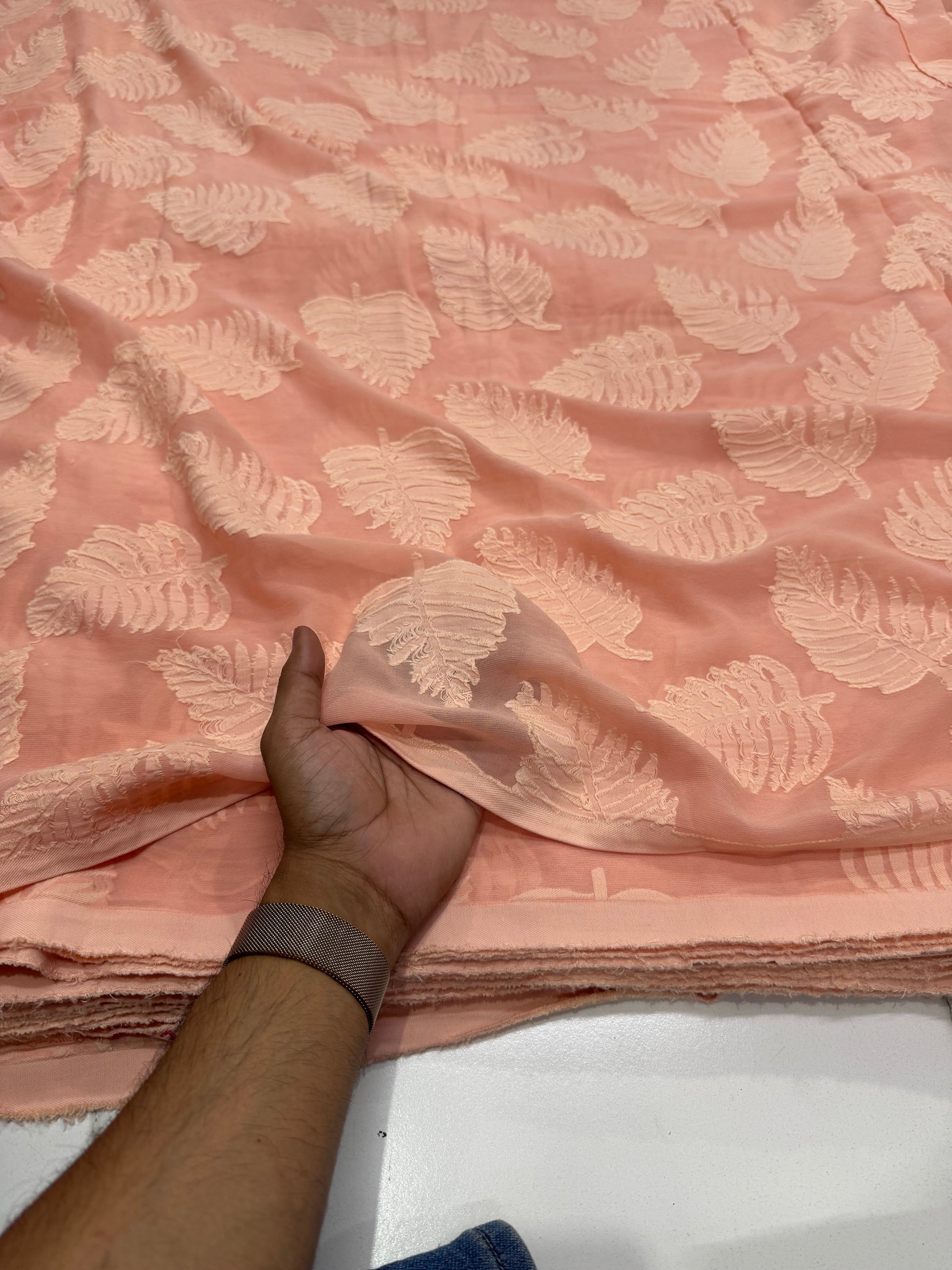 Viscose Silk Jacquard is a luxurious fabric crafted from viscose blended with silk, featuring intricate jacquard weaves. It has a soft, smooth texture with a subtle sheen, offering elegance and comfort. Perfect for ethnic wear, sarees, suits, and statement garments.